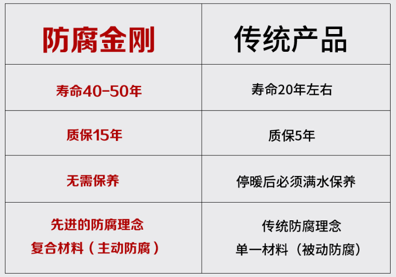 原理:活泼的镁、铝、锌金属同水中的离子产生化学反应不断清除,供暖水中的各种离子,从而有效的保护暖气片(低碳钢),从而也延长了暖气片寿命。而每一块镁铝锌合金片消耗时间超过15年以上,从而让防腐金刚暖气片比普通钢制暖气片寿命要长达2倍。
