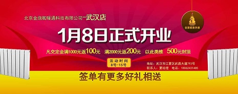北京金旗舰散热器入驻武汉,1月8日起正式开业,进店购物就有好礼,凡在店交定金满1000元即返100元,满2000元即返200元,以此类推,最高可返500元,更有好礼相送!