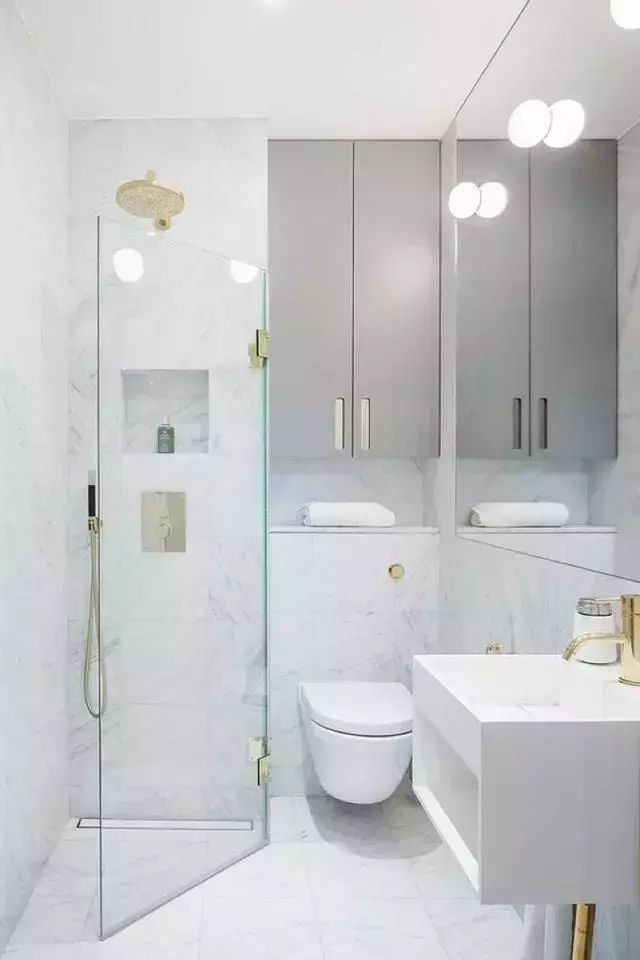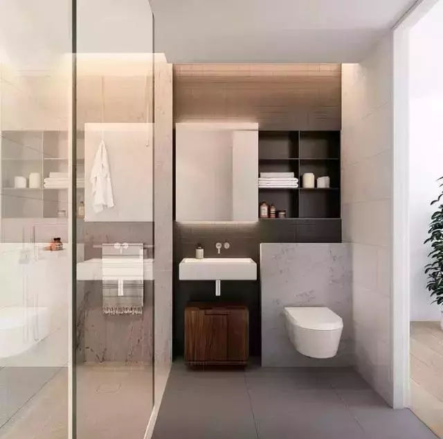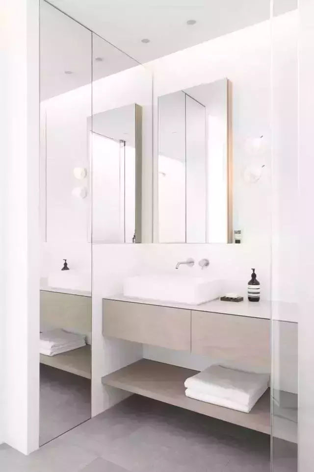 比如大尺寸的浴室镜可以令视觉深度增加,让卫生间看起来比实际效果扩大一倍以上;用玻璃隔断代替砌墙和淋浴帘,也能让卫浴空间看上去更通透。