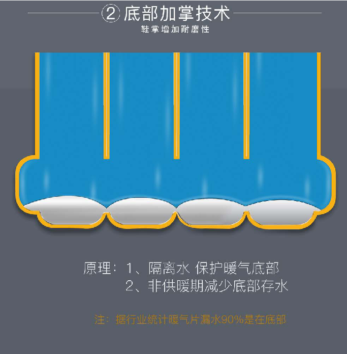 通过用户和市场的调查,你好发现钢制暖气片漏水90%都是底部,防腐金刚暖气片通过对底部,进行技术上的一些处理,让停暖之后不在有存水,从而?;ち烁种婆撞坎辉诟础?/p>